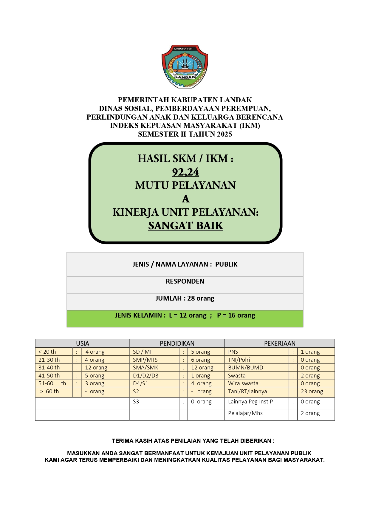 Adapun IKM Dinas Sosial, Pemberdayaan perempuan, perlindungan Anak, dan Keluarga Berencana Kabupaten Landak adalah sebagai berikut: